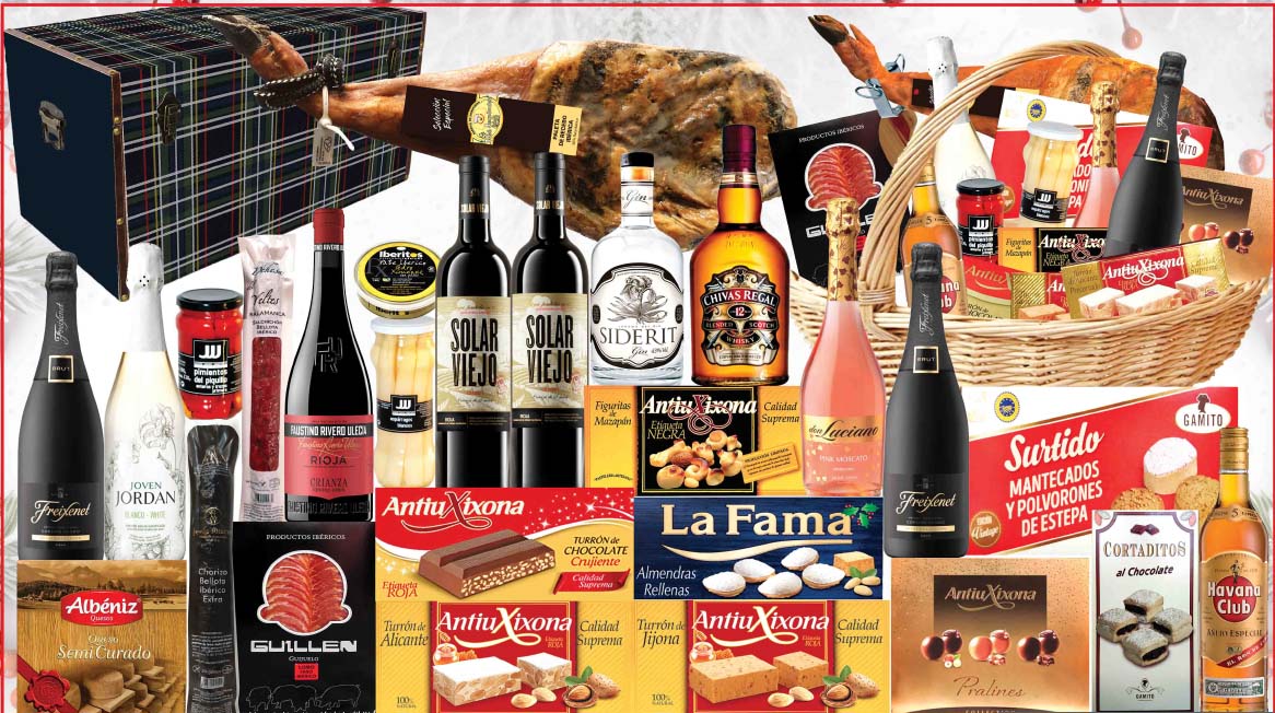 - Formato: cesta o baúl de madera con ibéricos, quesos, destilados, cavas, vinos y dulces.