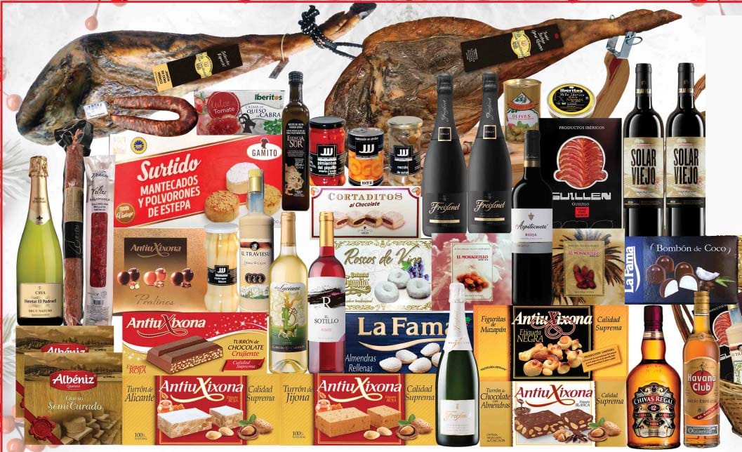 - Formato: baúl de madera con jamón (a elegir), ibéricos, queso, destilados, 2 cavas, 5 vinos y surtido navideño.